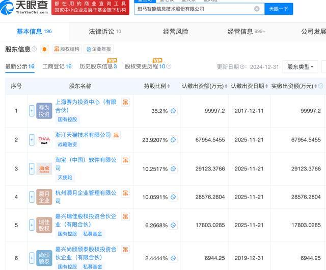 特别说明的是,斑马网络技术股份有限公司于2026年2月进行了工商变更,更名为如今的“斑马智能”。天眼查App信息显示,该公司的注册资本约为33.45亿元,法定代表人为张建锋,主要股东包括赛为投资、浙江天猫、淘宝中国等。