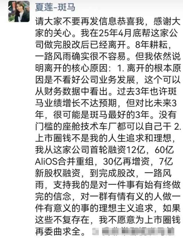 此前的2025年8月,在斑马智能(原斑马智行)第一次在港交所递交招股书后,该公司前首席财务官(CFO)夏莲曾在朋友圈发文,称自己在2025年4月底帮这家公司做完股改后已经离开。